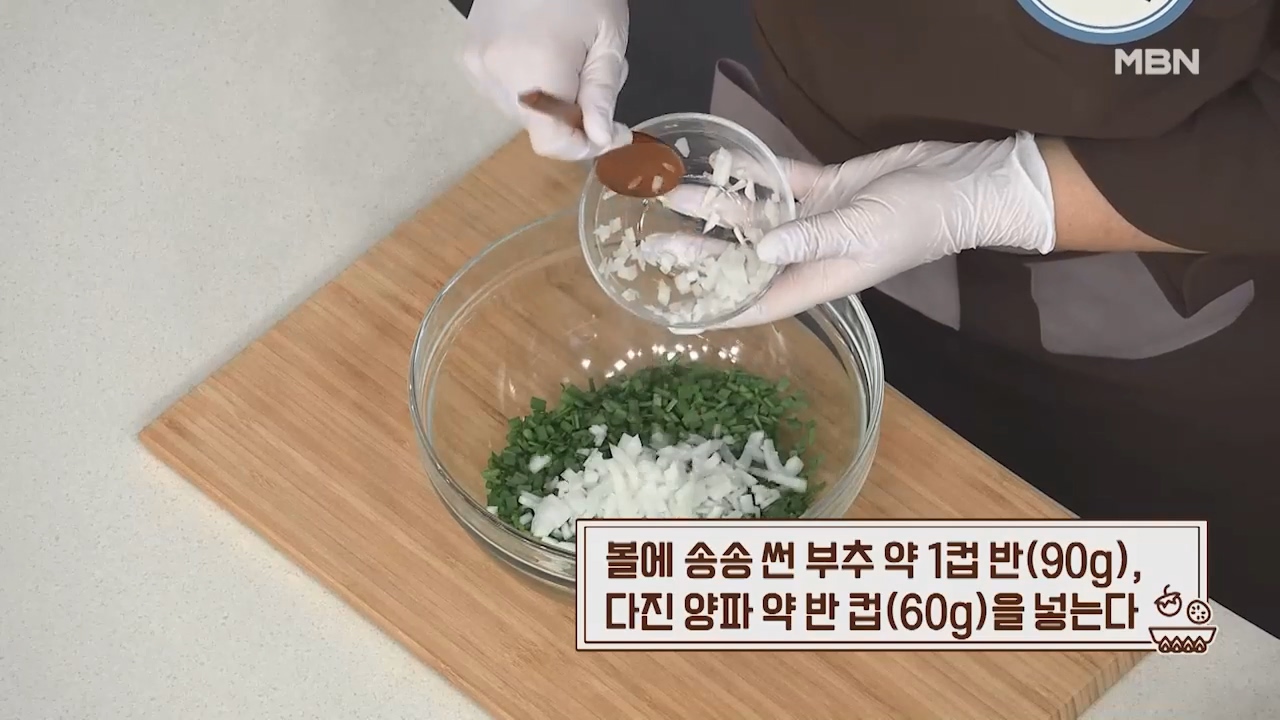 12. 볼에 송송 썬 부추 약 1컵 반(90g), 다진 양파 약 반컵 (60g)을 넣습니다.