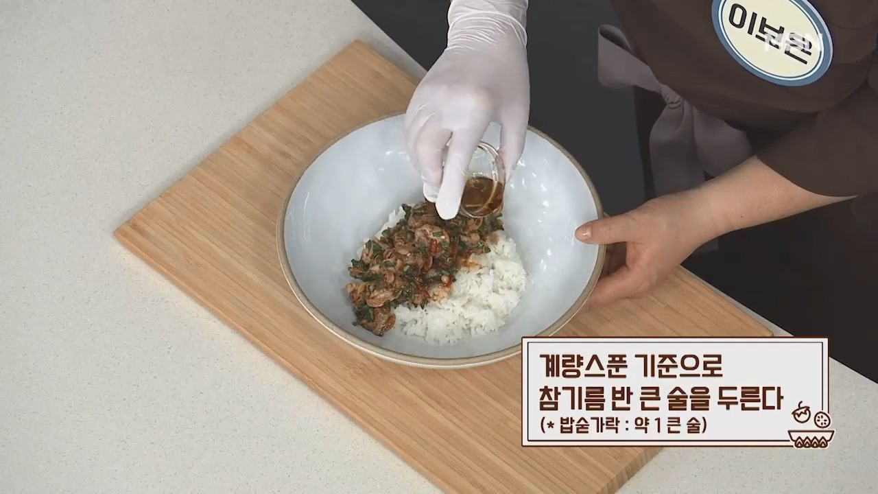 20. 계량스푼 기준으로 참기름 반 큰술을 두릅니다. (밥숟가락 약 1큰술)