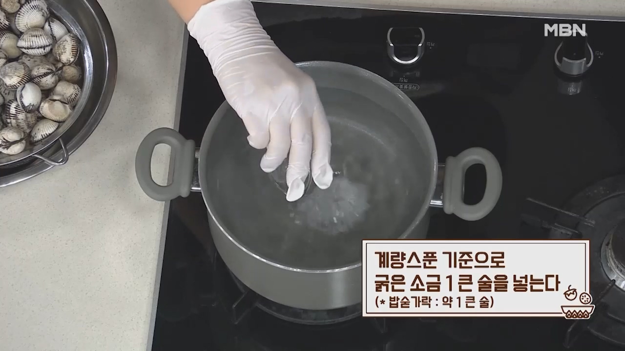 1. 찬물 1.5리터에 소금 2큰술, 해감한 꼬막 2kg을 넣고 불을 켭니다.
