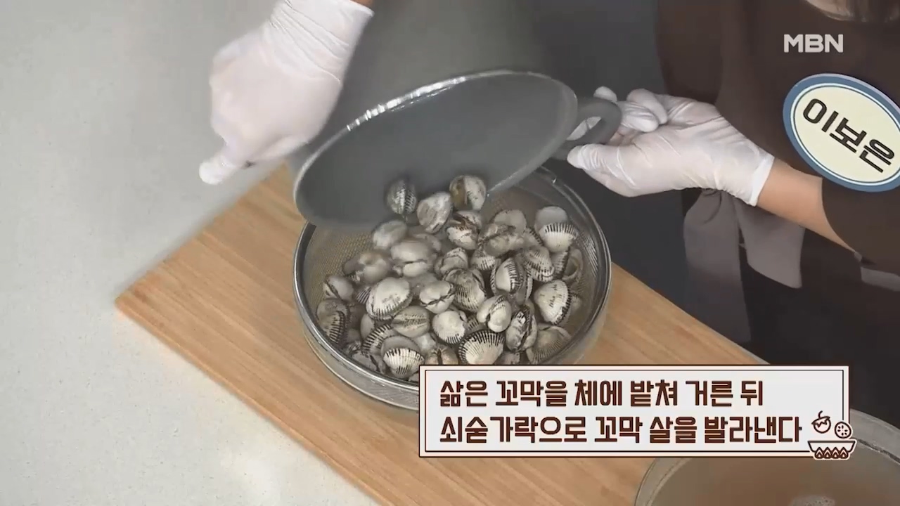 11. 삶은 꼬막을 체에 밭쳐 거른 뒤 쇠숟가락으로 꼬막 살을 발라냅니다.