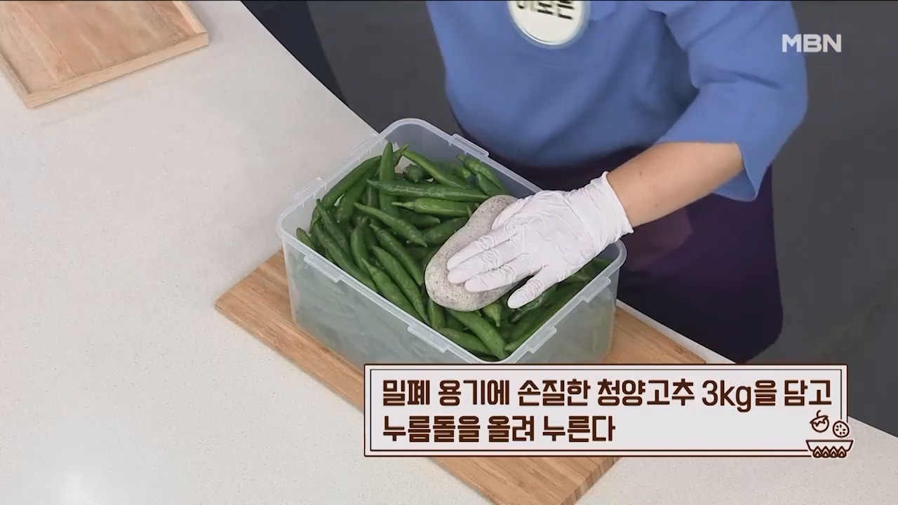 3. 밀폐용기에 손질한 청양고추 3kg을 담고 누름돌을 올려 누릅니다.