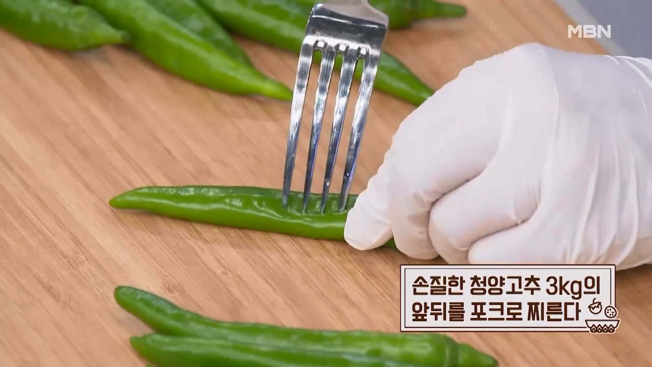 2. 손질한 청양고추 3kg의 앞뒤를 포크로 찔러줍니다.