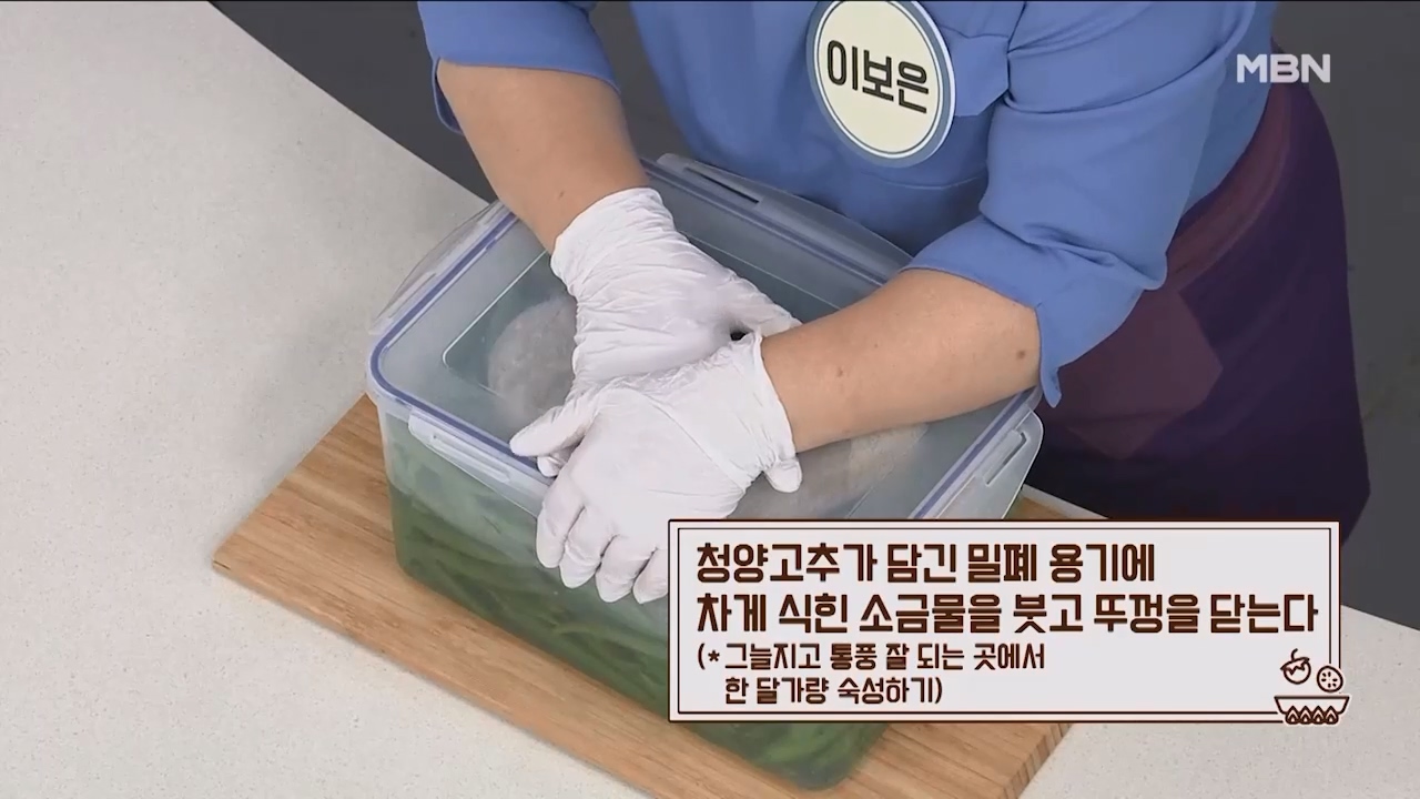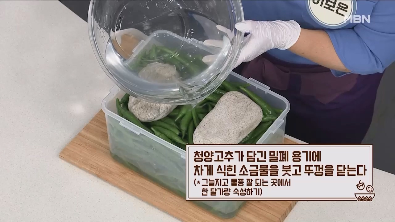 6. 청양고추가 담긴 밀폐용기에 차게 식힌 소금물을 붓고 뚜껑을 닫아 그늘지고 통풍 잘되는 곳에서 한달가량 숙성시키면 삭힌고추가 완성됩니다.