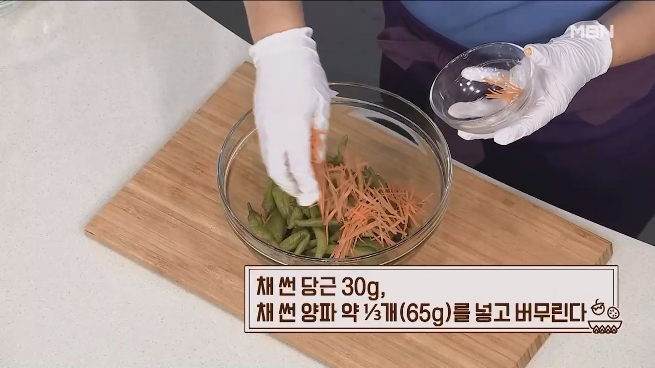 9. 채 썬 당근 30g, 채 썬 양파 약 1/3개(65g)를 넣고 버무립니다.
