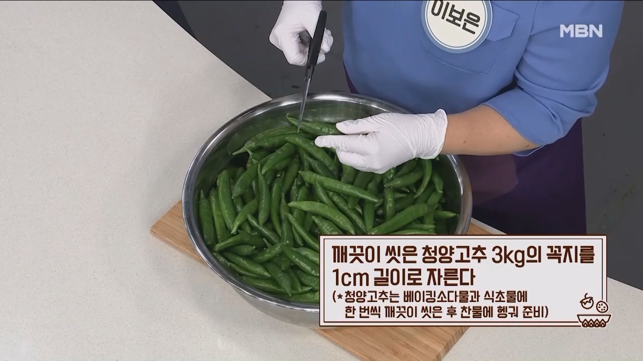 1. 깨끗이 씻은 청양고추 3kg의 꼭지를 1cm 길이로 잘라줍니다.