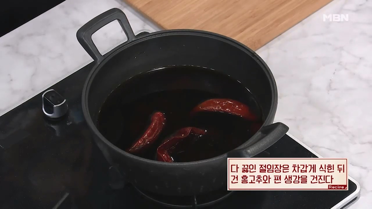 9. 다 끓인 절임장은 차갑게 식힌 뒤 건 홍고추와 편 생강을 건집니다.