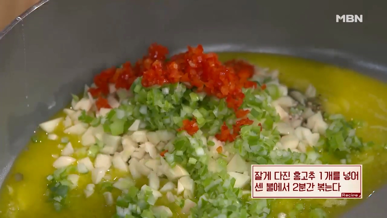 3. 잘게 다진 홍고추 1개를 넣어 센불에서 2분간 볶아줍니다.