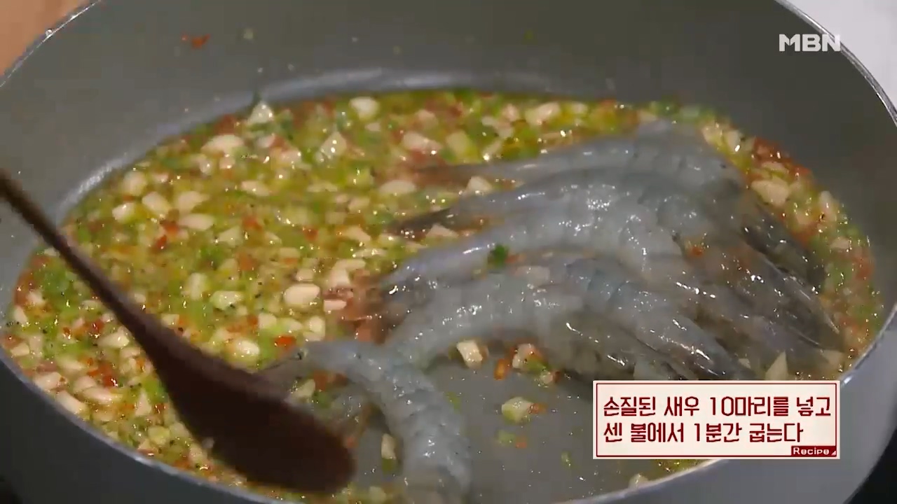 4. 손질된 새우 10마리를 넣고 센불에서 1분간 구워줍니다.
