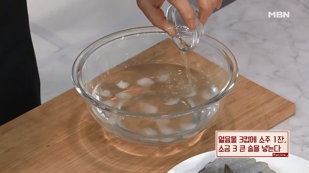 5. 얼음물 3컵에 소주 1잔 소금 3큰술을 넣습니다.