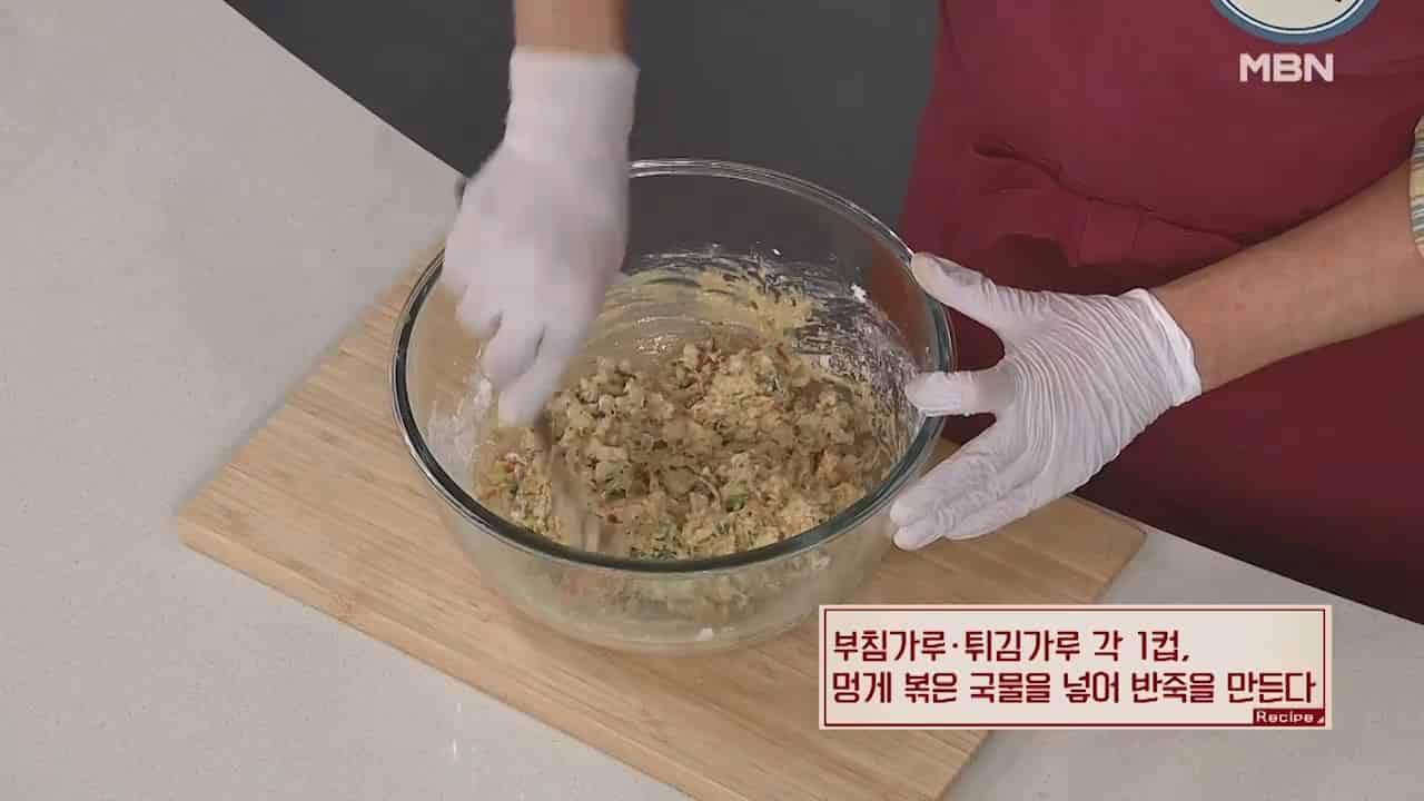 5. 부침가루, 튀김가루 각 1컵, 멍게 볶은 국물을 넣어 반죽을 만듭니다.