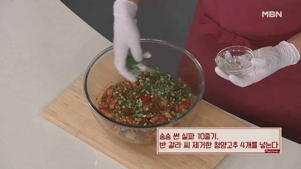 7. 송송 썬 실파 10줄기, 반 갈라 씨 제거한 청양고추 4개를 넣습니다.