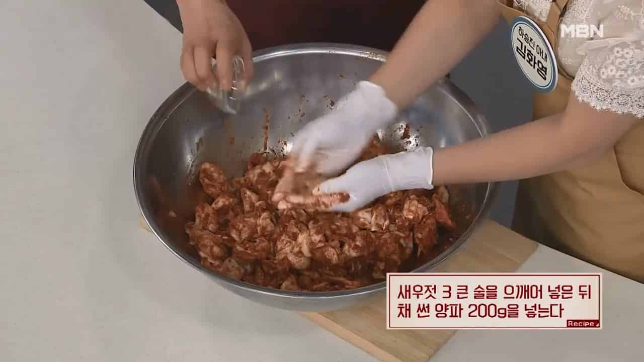 11. 새우젓 3큰술을 으깨어 넣은 뒤 채 썬 양파 200g을 넣습니다.