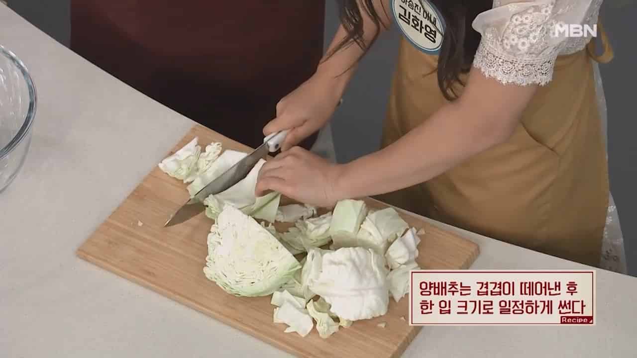 2. 양배추는 겹겹이 떼어낸 후 한입 크기로 일정하게 썰어줍니다.