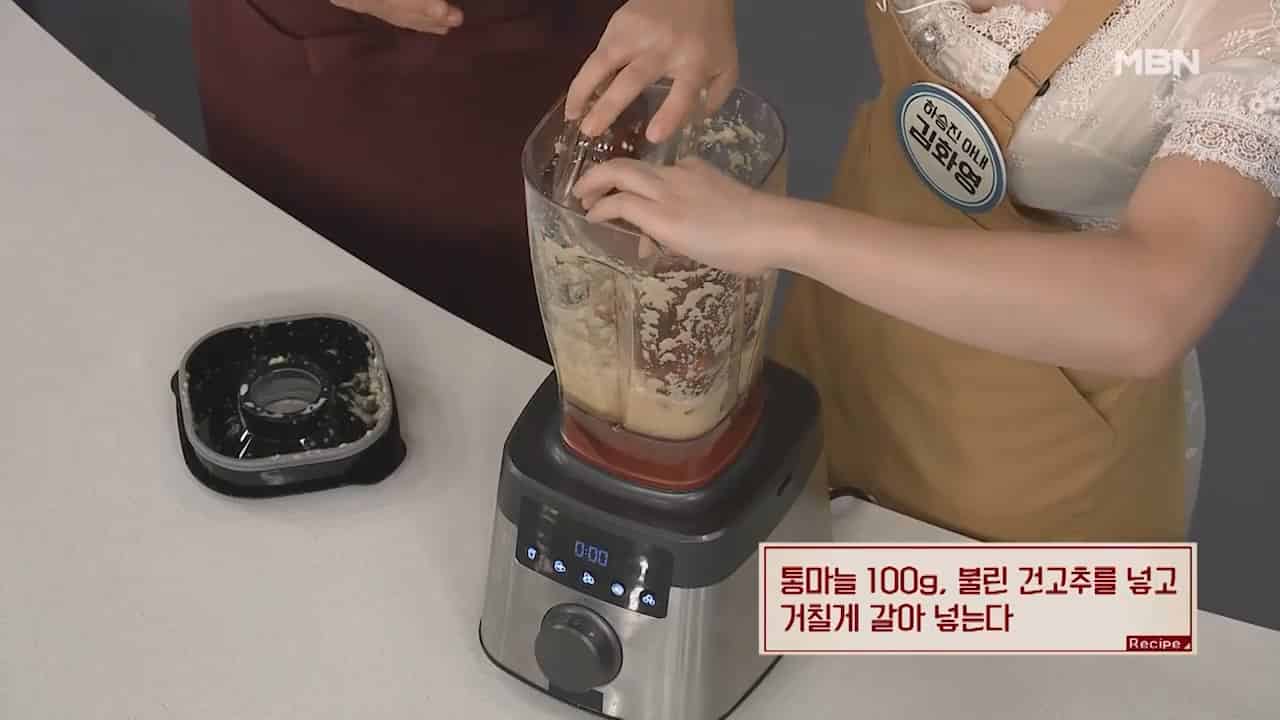 8. 통마늘 100g, 불린 건고추를 넣고 거칠게 갈아 넣습니다.