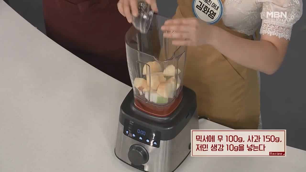 6. 믹서기에 무 100g, 사과 150g, 저민 생강 10g을 넣습니다.
