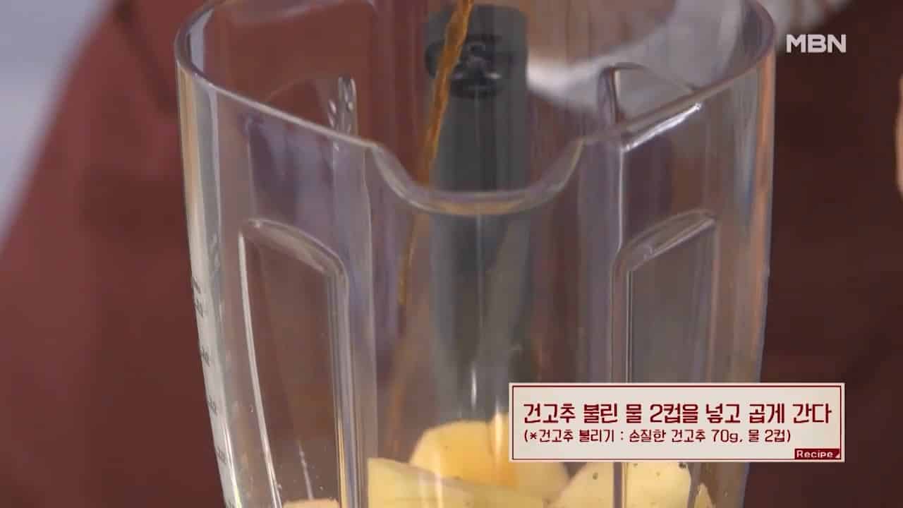 7. 건 고추 불린물 2컵을 넣고 곱게 갈아줍니다. (건고추 불리는법 : 손질한 건고추 70g, 물 2컵)