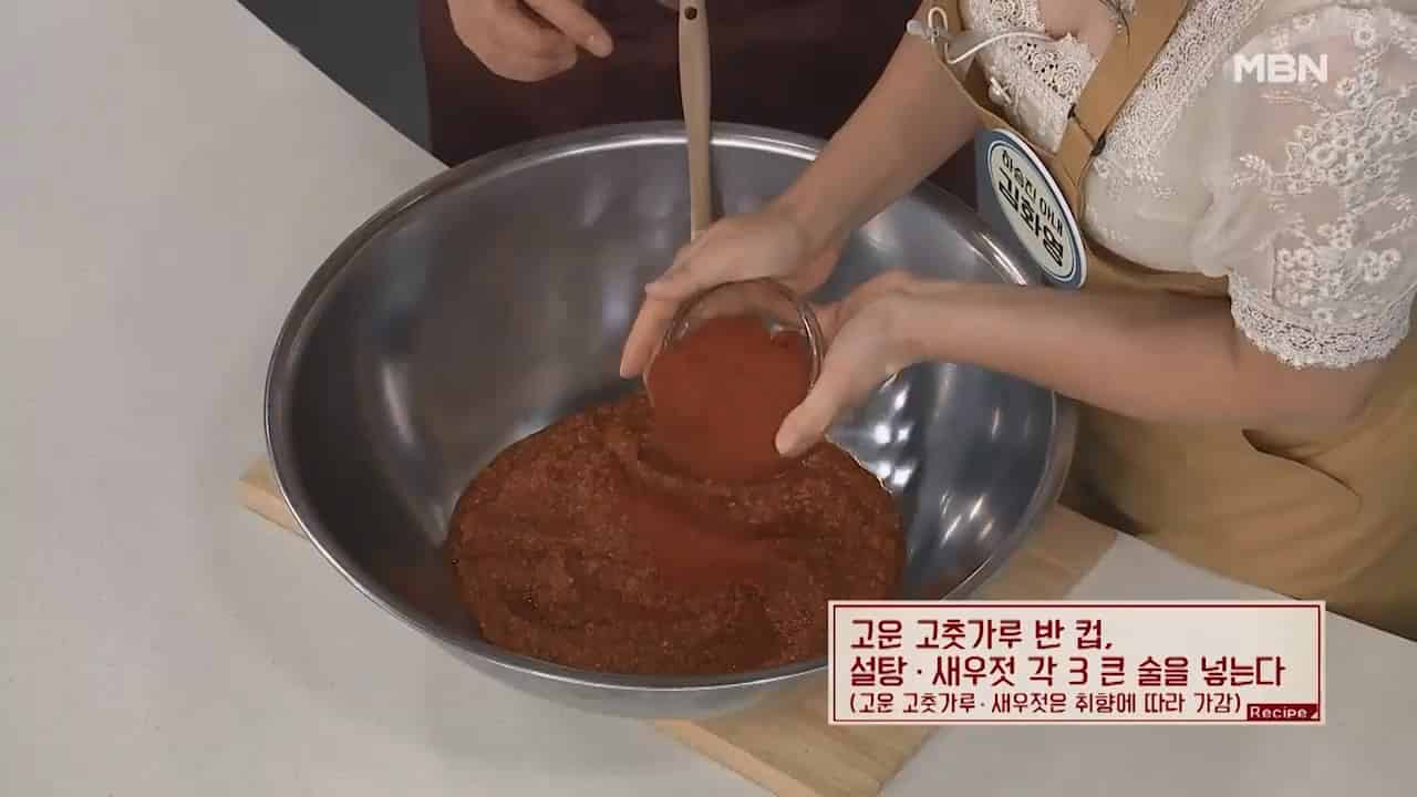 9. 고운 고춧가루 반 컵, 설탕 3큰술 새우젓 3큰술을 넣습니다. (고운 고춧가루와 새우젓은  취향에 따라 가감합니다.)