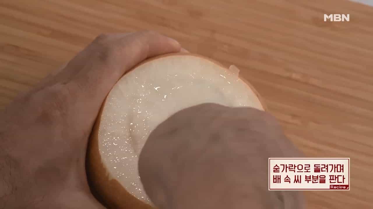 2. 배 속을 숟가락으로 돌려가며 배 속 씨 부분을 파냅니다.