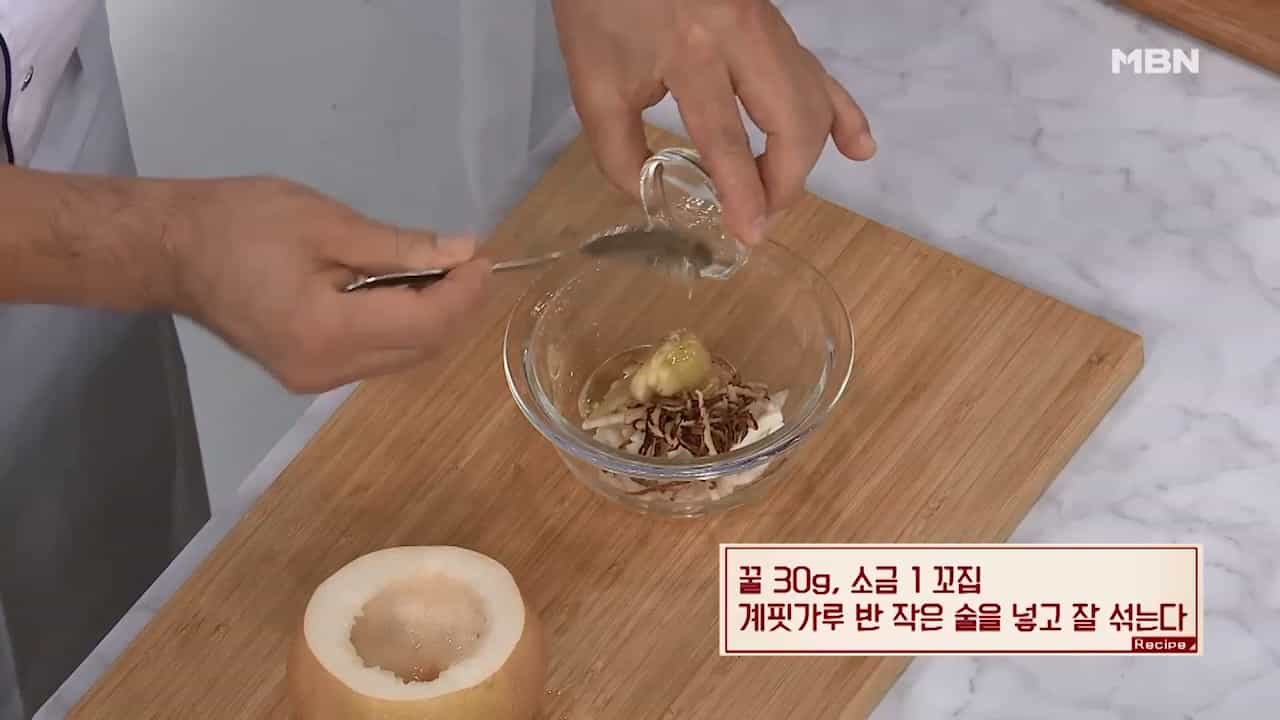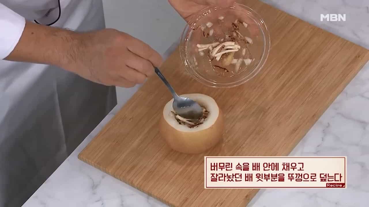 6. 버무린 속을 배 안에 채우고 잘라놨던 배 윗부분을 뚜껑으로 덮어줍니다.
