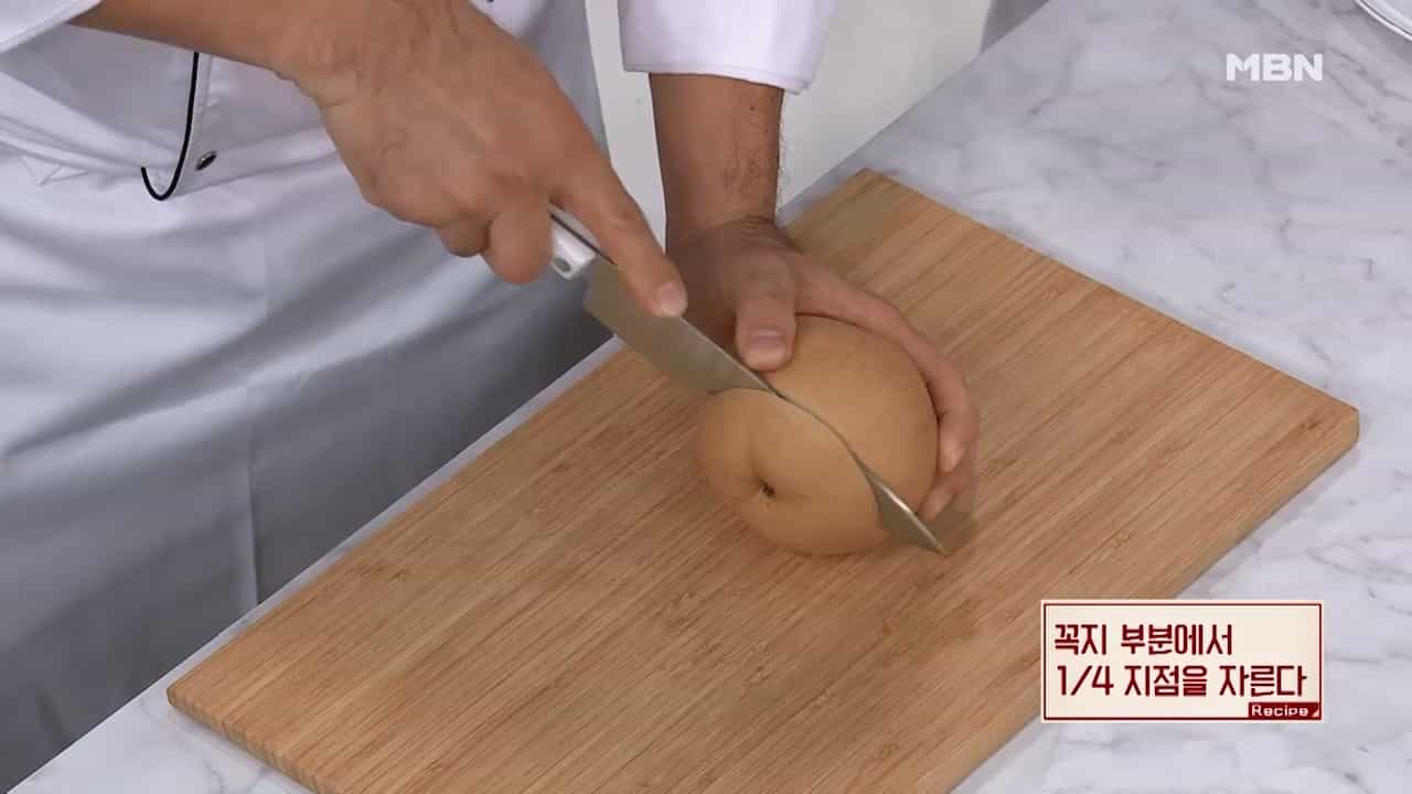1. 배 꼭지 부분에서 1/4 지점을 잘라줍니다.