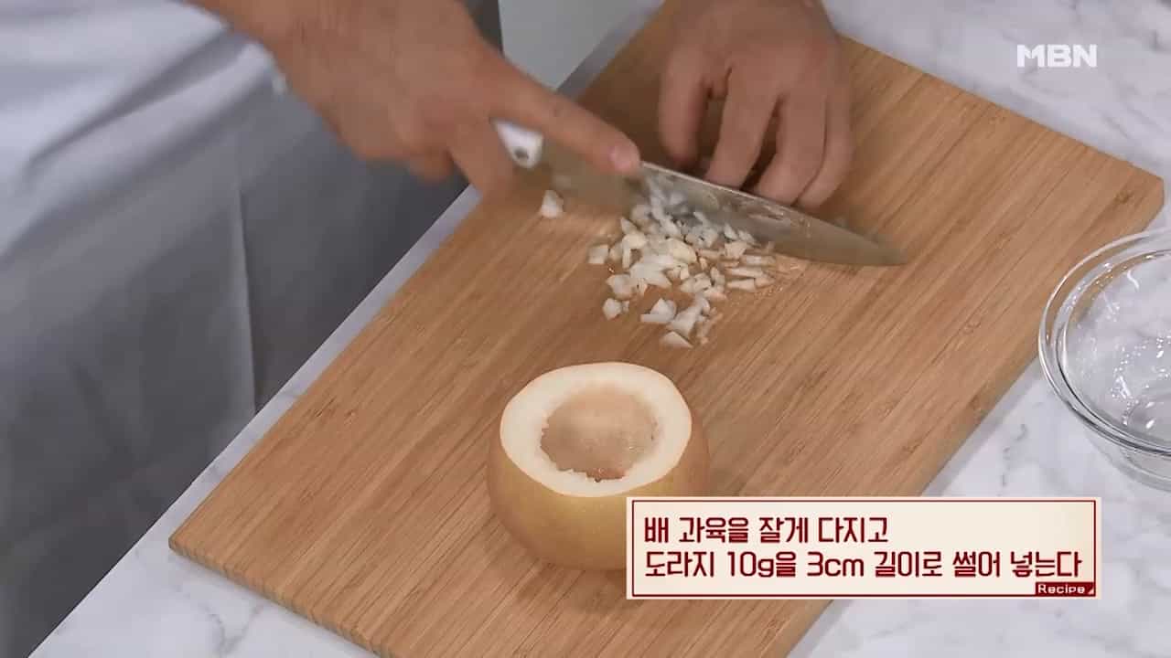3. 배 과육을 잘게 다지고 도라지 10g을 3cm길이로 썰어 놓습니다.