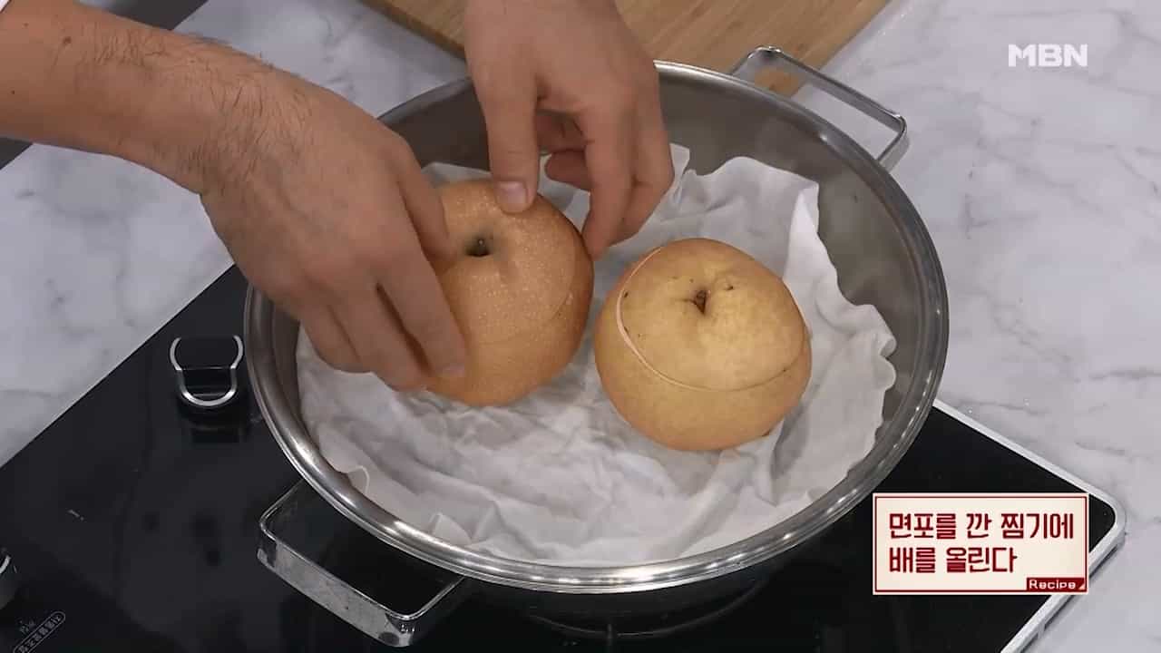 7. 면포를 깐 찜기에 배를 올립니다.