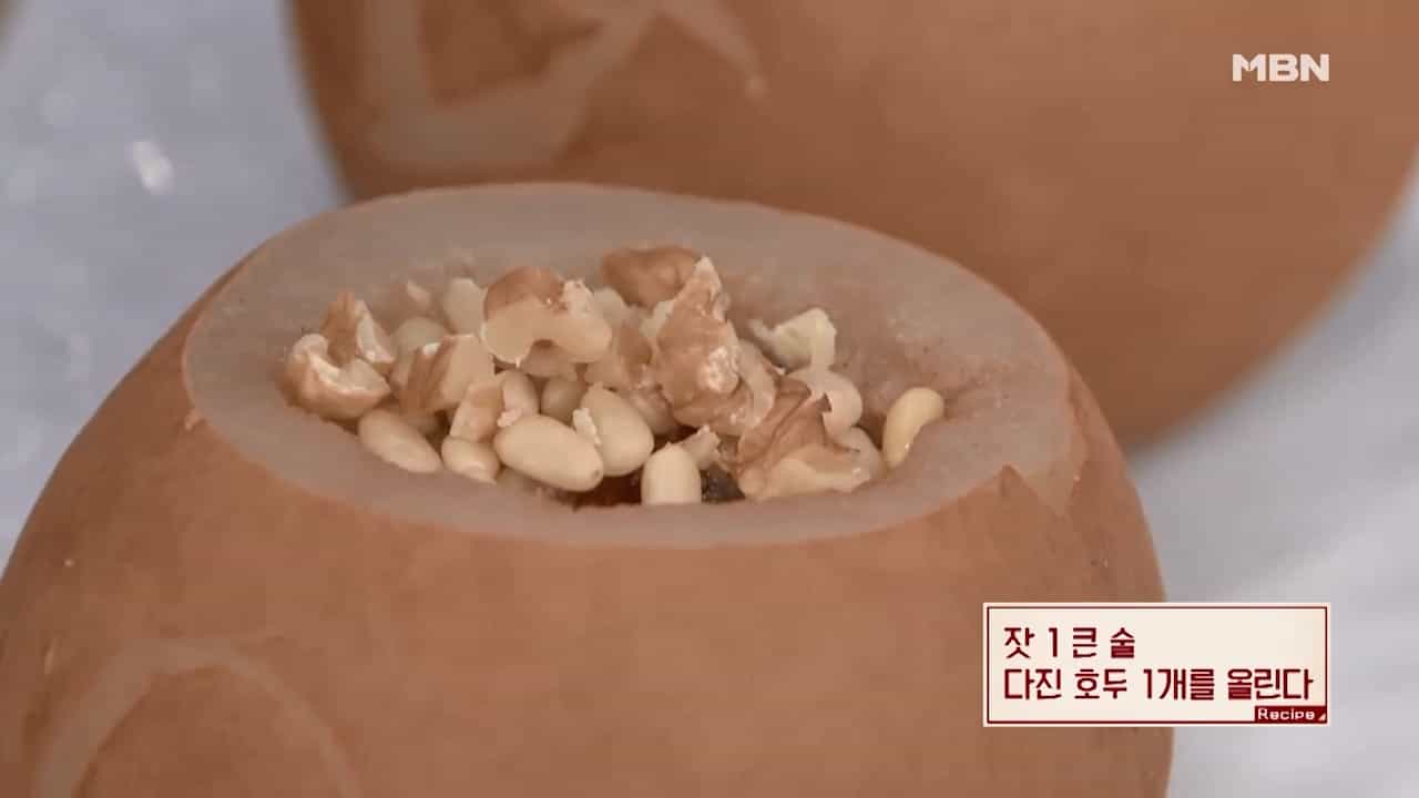 9. 잣 1큰술과 다진 호두 1개를 올리면 감기에 좋은 배찜이 완성됩니다.