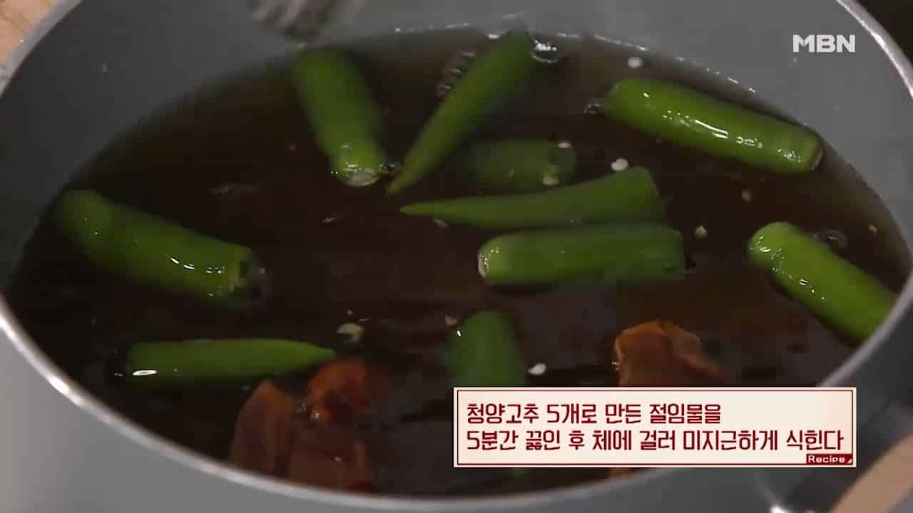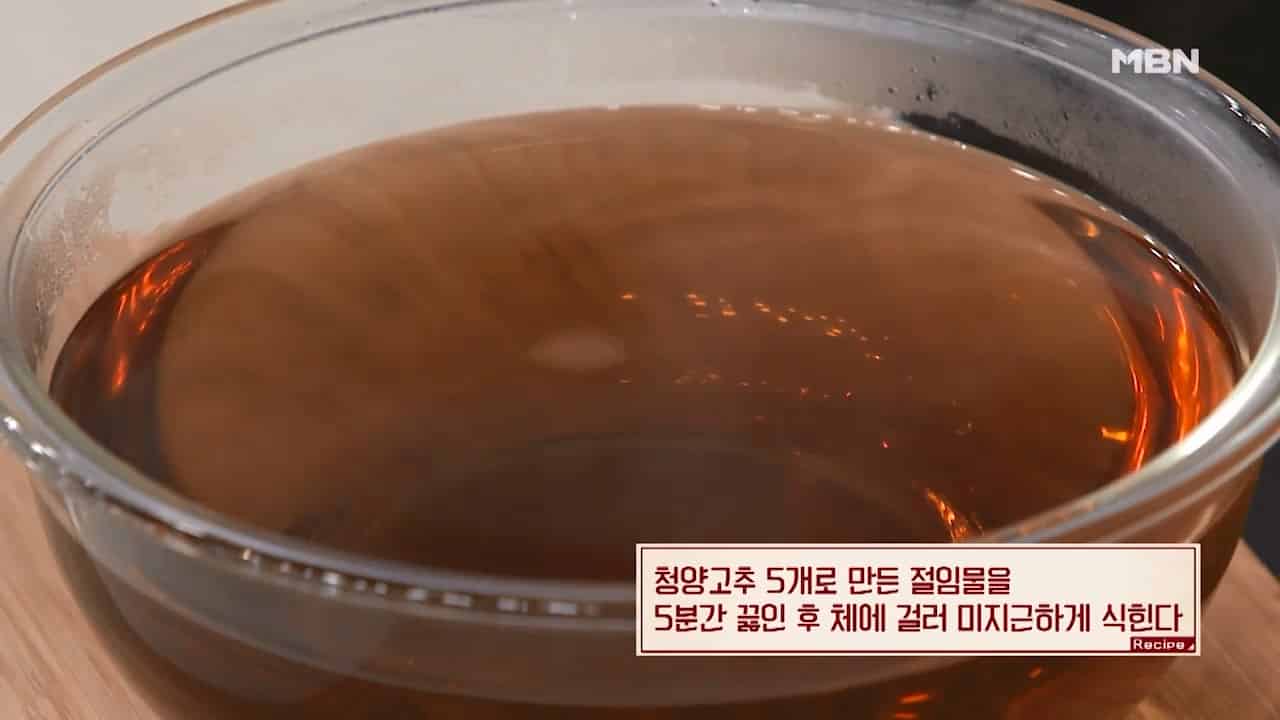 3. 청양고추 5개를 냄비에 넣고 5분간 끓인 후 체에 걸러 미지근하게 식혀줍니다.