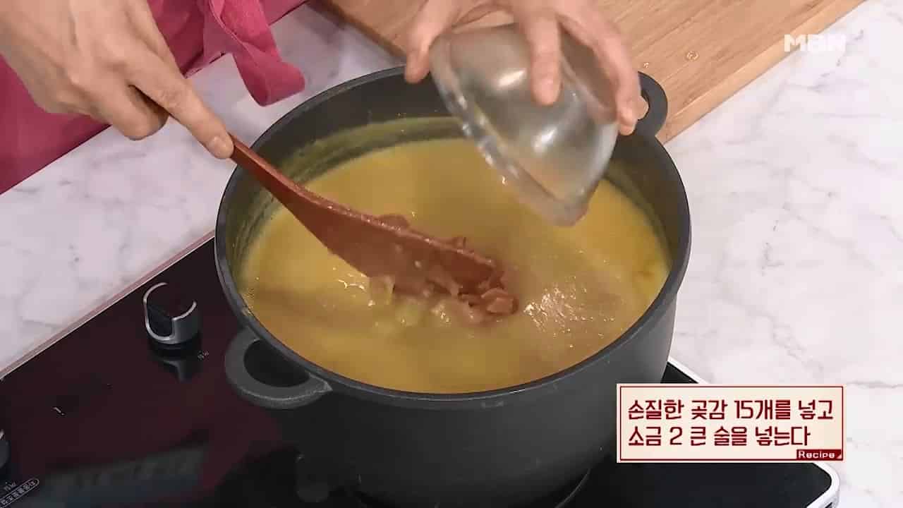 10. 손질한 곶감 15개를 넣고 소금 2큰술을 넣어줍니다.