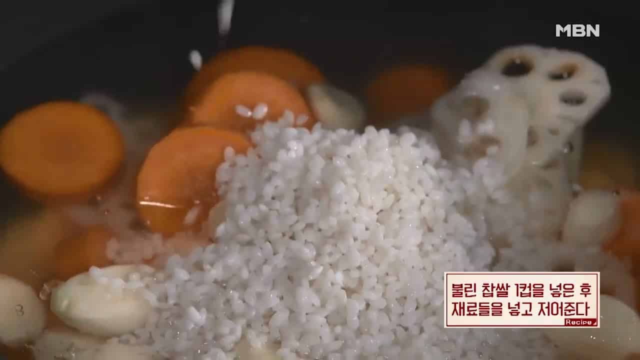 7. 불린 찹쌀 1컵을 넣은 후 재료들을 넣고 저어줍니다.
