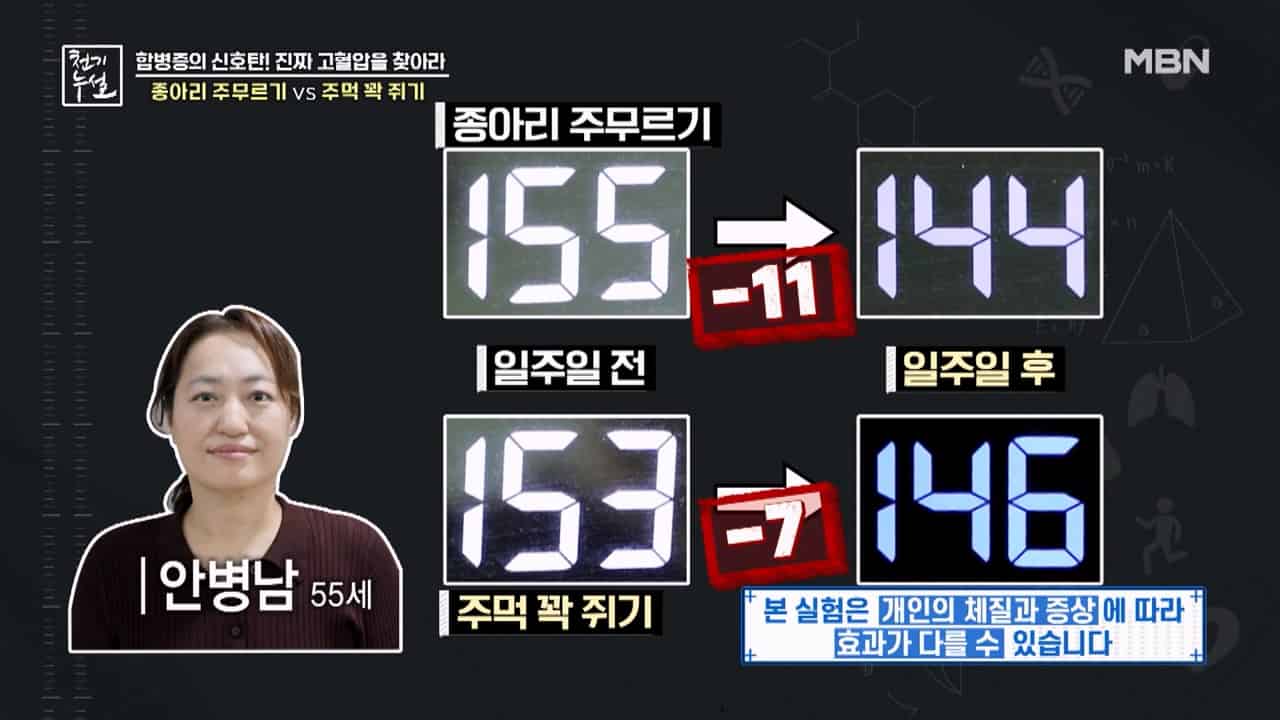 천기누설에서 고혈압에 좋은 민간요법으로 간단한 혈압 낮추는 법을 알려줬는데요. 간단한 혈압 낮추는 법은 종아리 주무르기와 주먹을 줬다폈다 하는 방법입니다. 실제로 혈압 낮추는 법 실험을 해봤더니 효과가 있었다고 하는데요. 혈압 높으신 분들은 집에서 한번 따라해보세요.