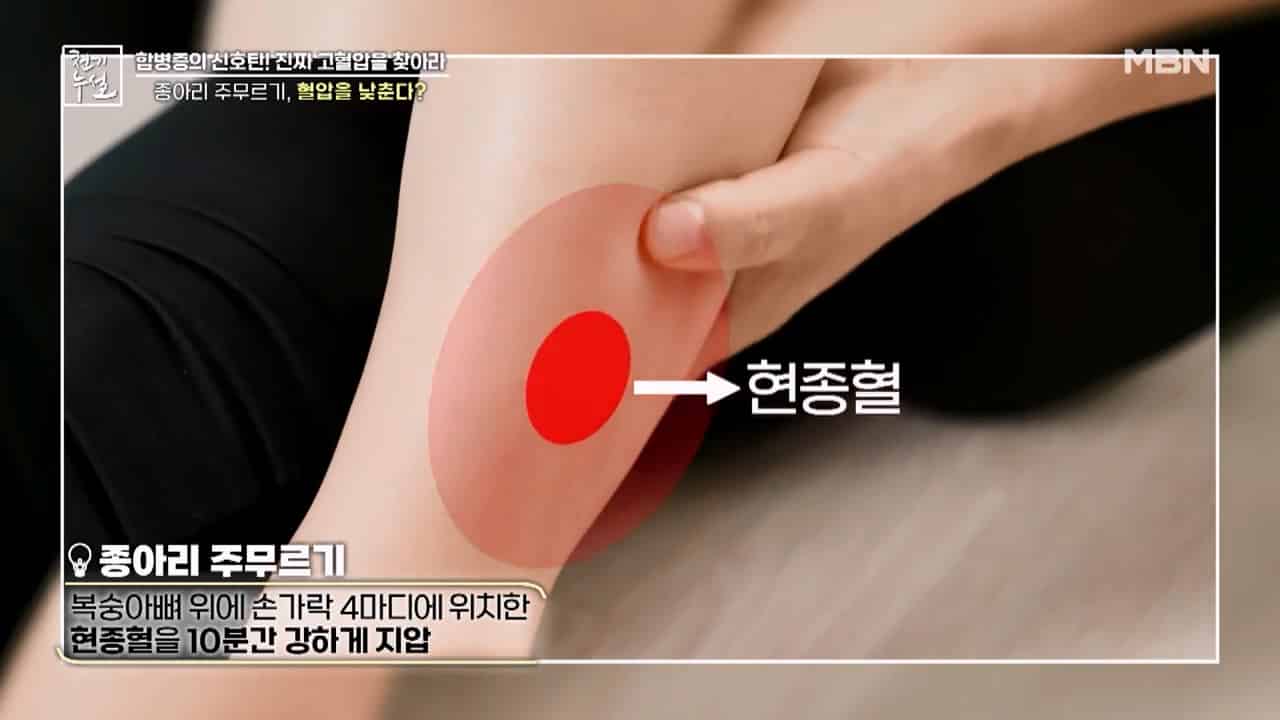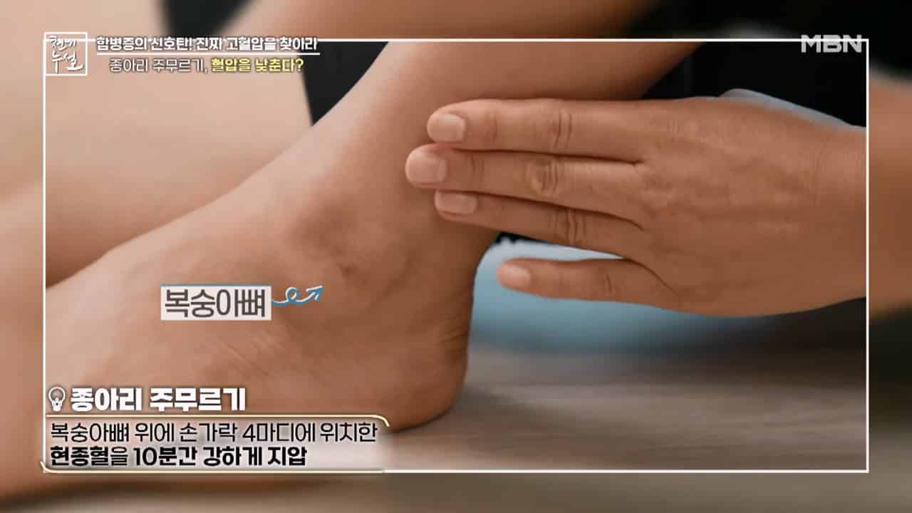 - 복숭아뼈 위에 손가락 4마디에 위치한 현종혈을 10분간 강하게 위아래로 주무르면서 지압을 해주면 혈압을 낮추는데 도움이 된다고 합니다.