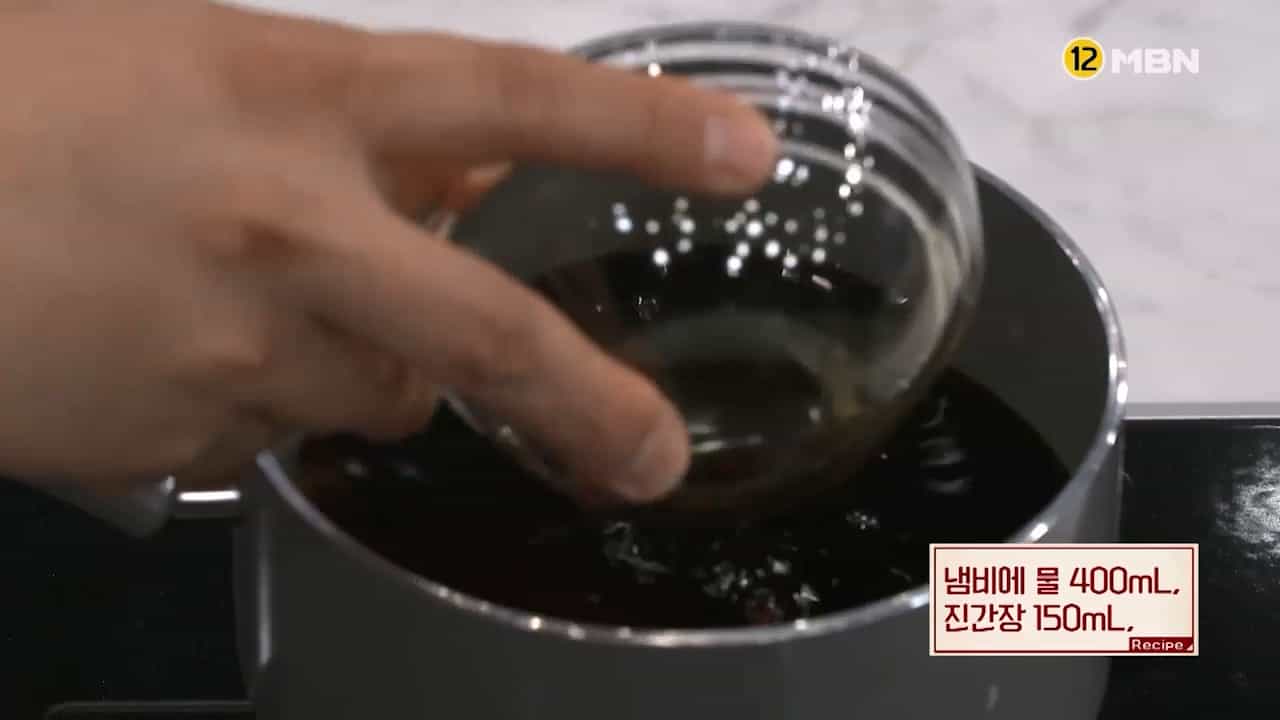 1. 냄비에 물 400mL와 진간장 150mL을 붓습니다.