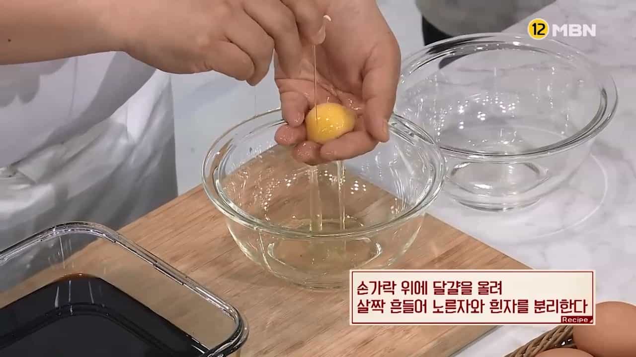 8. 손가락 위에 달걀을 올려 살짝 흔들어 노른자와 흰자를 분리합니다.