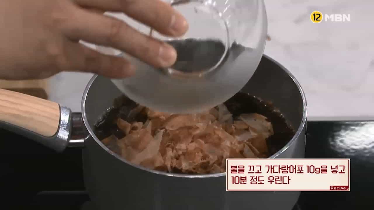 4. 불을 끄고 가다랑어포 10g을 넣고 10분 정도 우려줍니다.