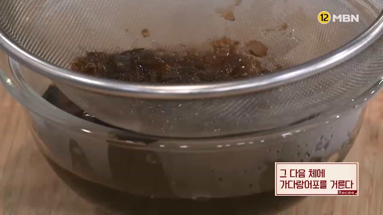 5. 가다랑어포를 10분 정도 우렸으면 체에 가다랑어포를 걸러줍니다.
