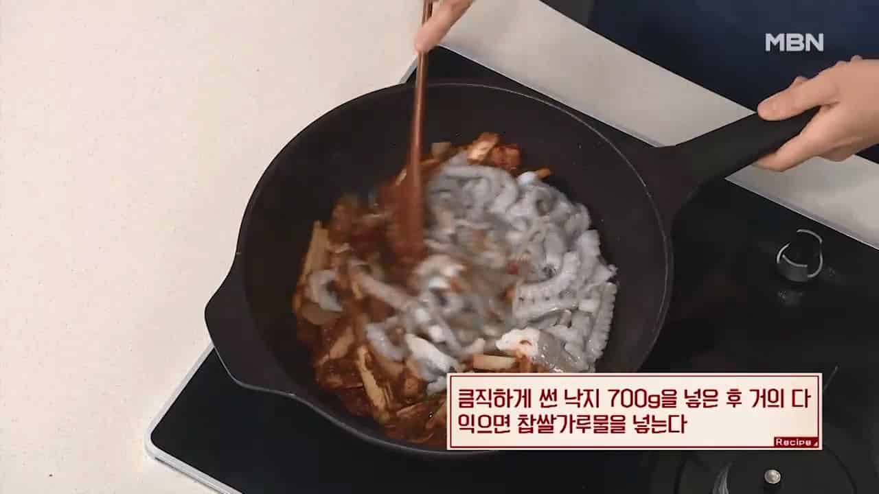 9. 큼직하게 썬 낙지 700g을 넣은 후 거의 다 익으면 찹쌀가루물을 넣습니다.