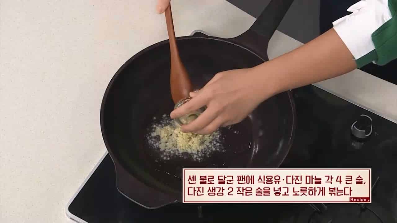 6. 센불로 달군 팬에 식용유 4큰술을 붓고 다진마늘 4큰술 생강 2작은술을 넣고 노릇하게 볶아줍니다.