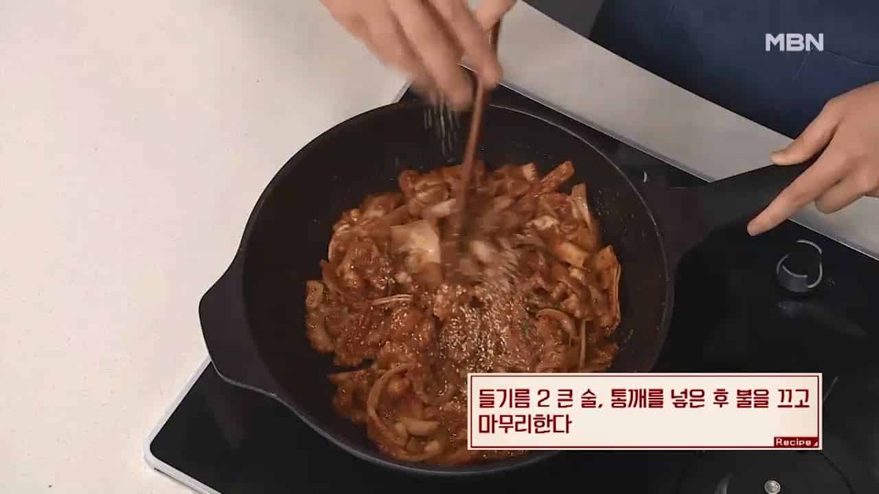 10. 잘 볶아진 낙지볶음에 들기름 2큰술, 통깨를 넣은 후 불을 끄고 마무리 하면 맛있는 낙지볶음이 완성됩니다.