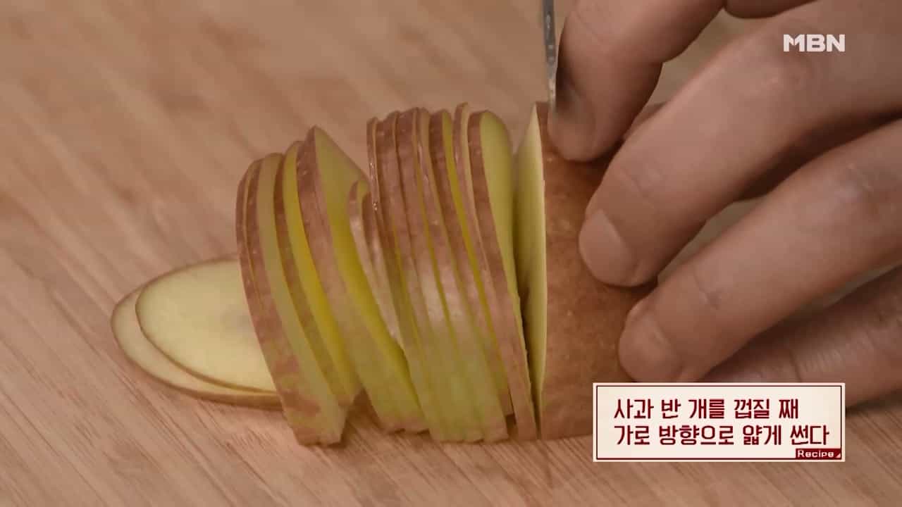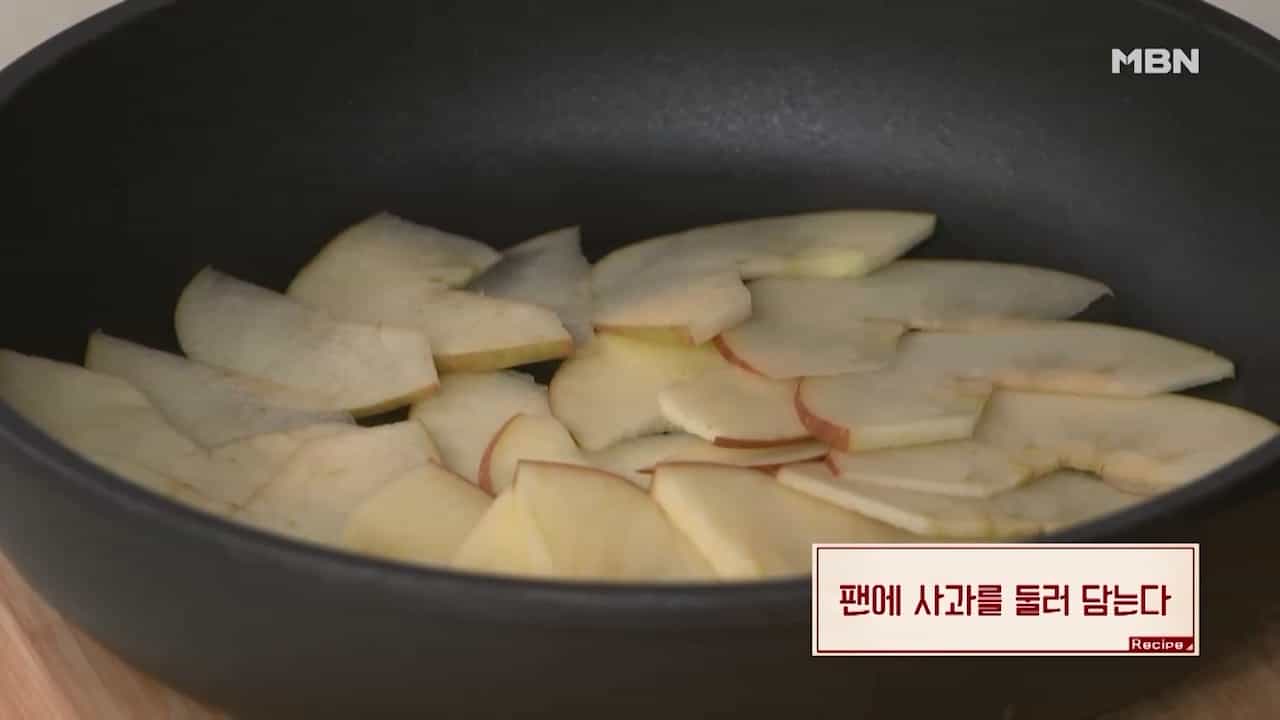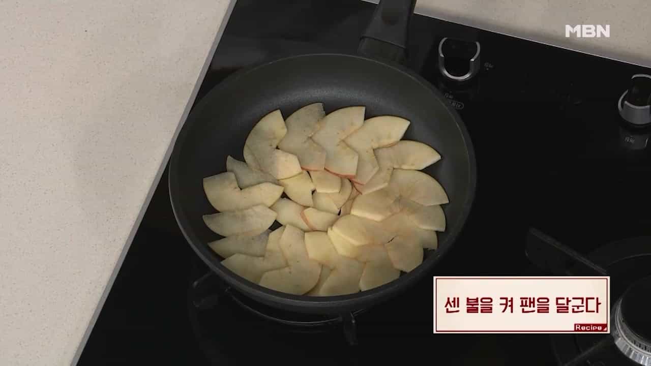 2. 후라이팬에 얇게 자른 사과를 둘러 담습니다.