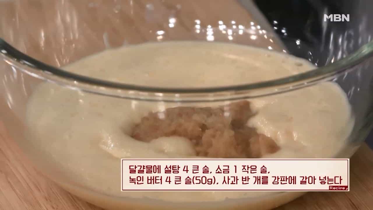 3. 달걀물에 설탕 4큰술, 소금 1 작은술, 녹인 버터 4큰술(50g), 사과 반개를 강판에 갈아 넣습니다.