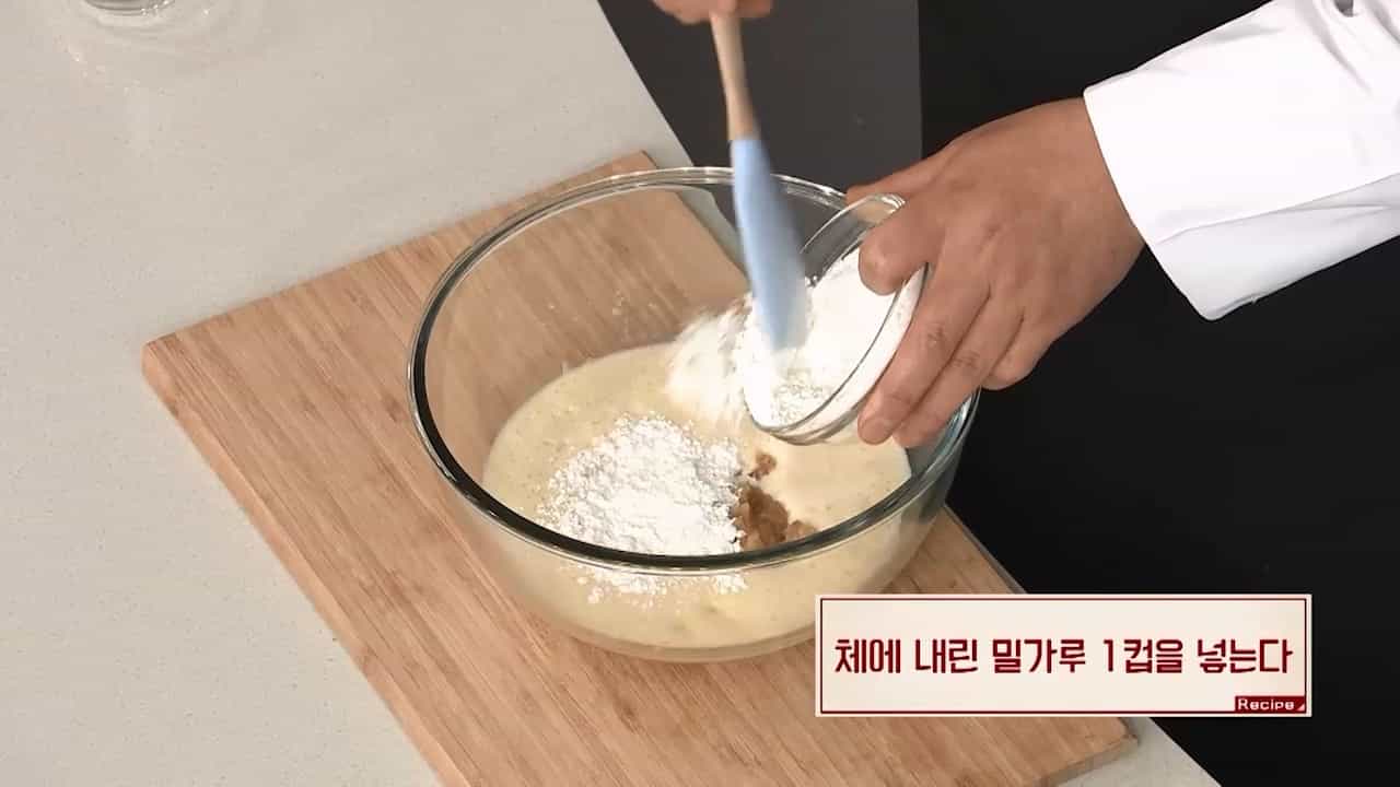 4. 체에 내린 밀가루 1컵을 넣습니다.
