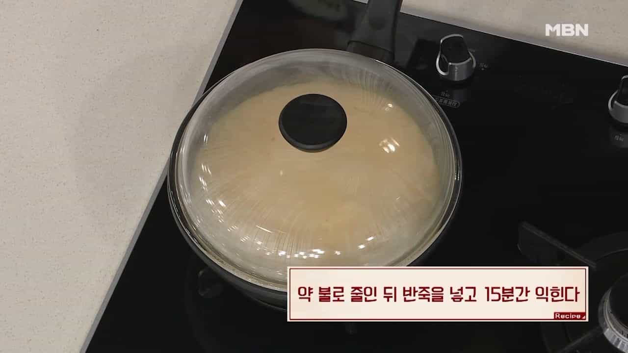 7. 약불로 줄인 뒤 반죽을 펴올리고 15분간 익혀줍니다.