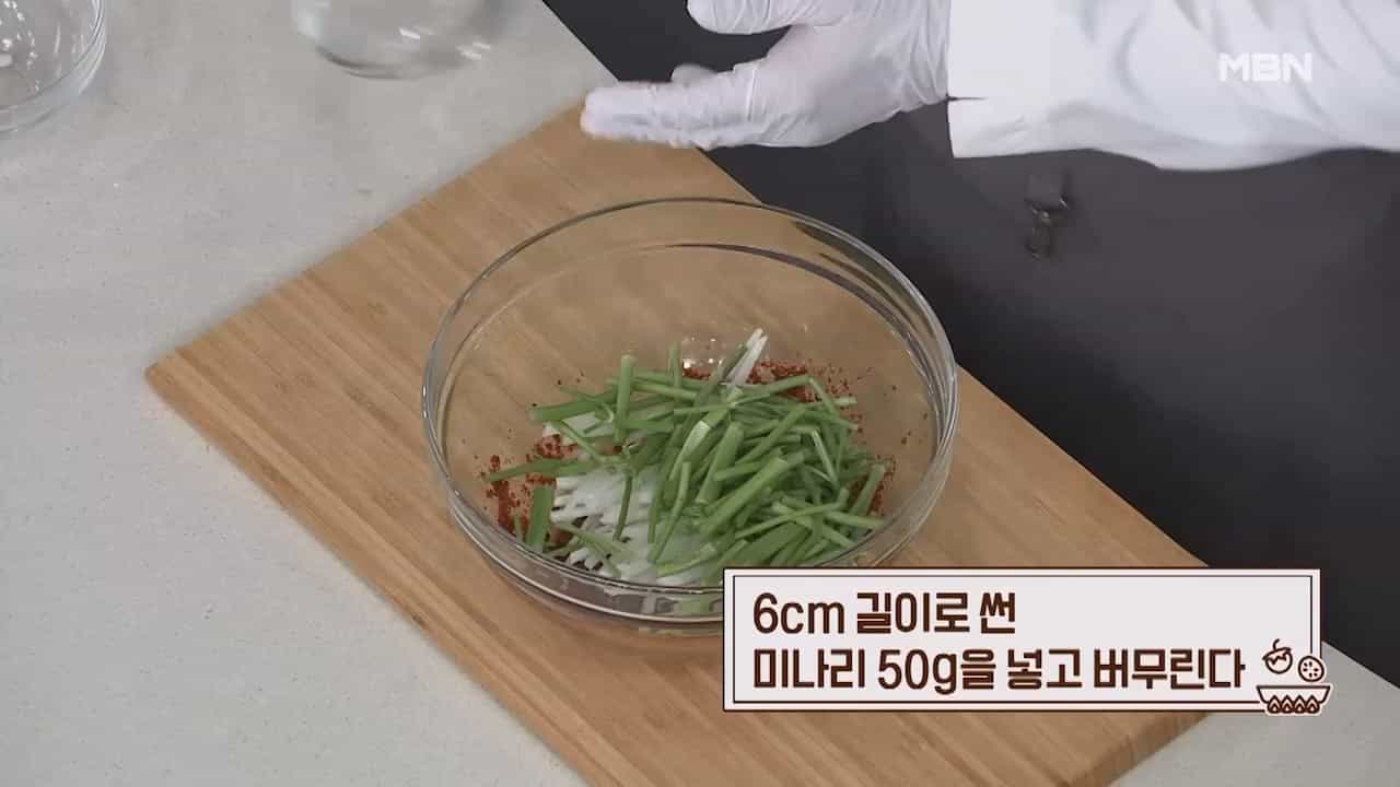 7. 6cm 길이로 썬 미나리 50g을 넣고 버무려 줍니다.