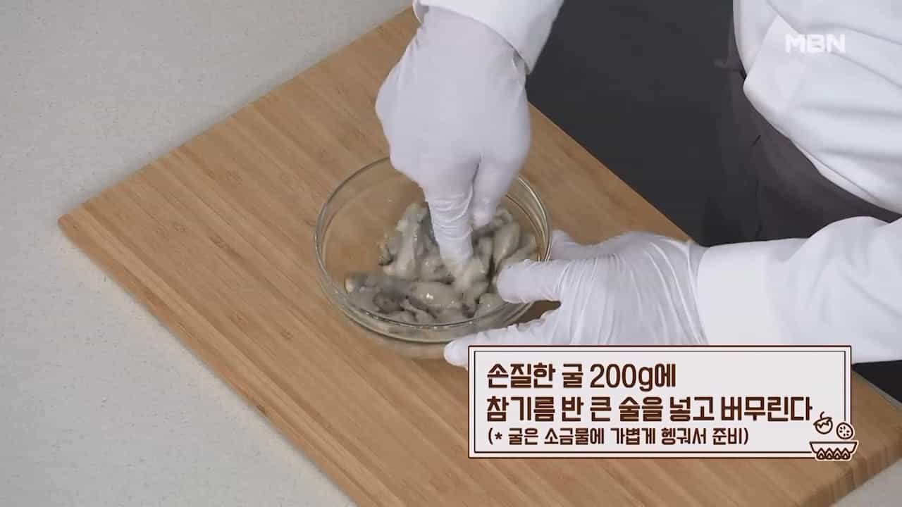 1. 손질한 굴 200g에 참기름 반 큰술을 넣고 버무려 줍니다. (굴은 소금물에 가볍게 헹궈서 준비합니다.)