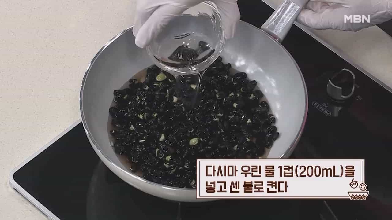3. 마른팬에 불린 서리태와 서리태 불린 물 1컵(200ml)을 넣습니다.