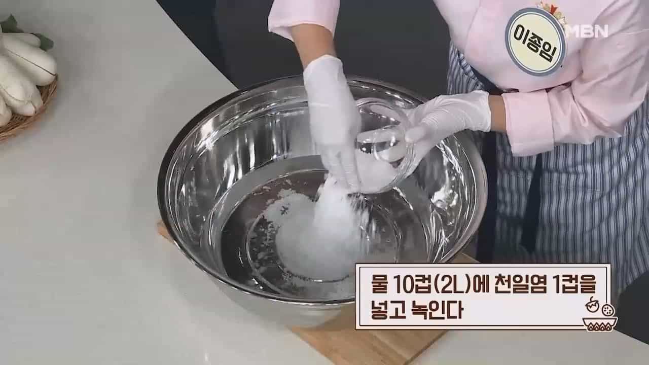 3. 물 10컵(2리터)에 천일염 1컵을 넣고 녹여줍니다.