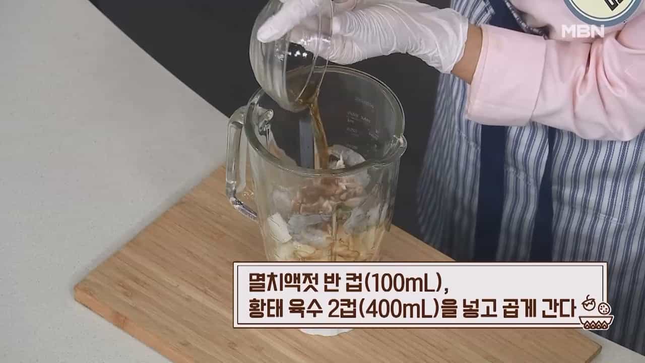 10. 멸치액젓 반컵(100mL), 황태 육수 2컵(400mL)을 넣고 곱게 갈아줍니다.