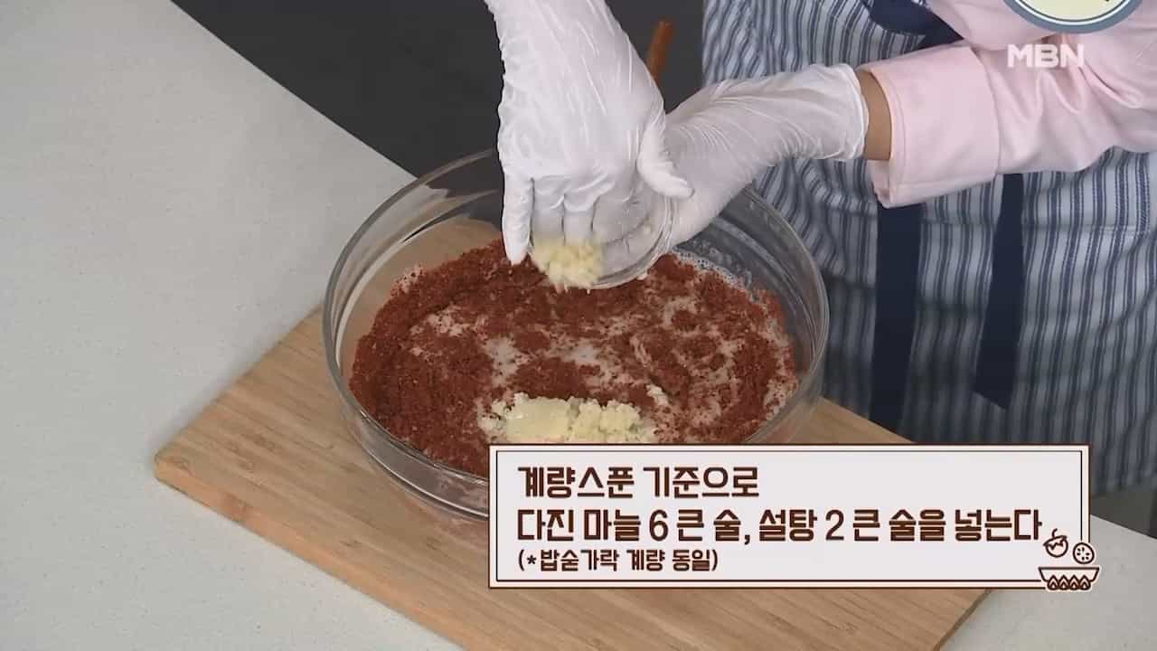 13. 계량스푼 기준으로 다진 마늘 6큰술, 설탕 2큰술을 넣습니다. (밥숟가락 계량 동일)