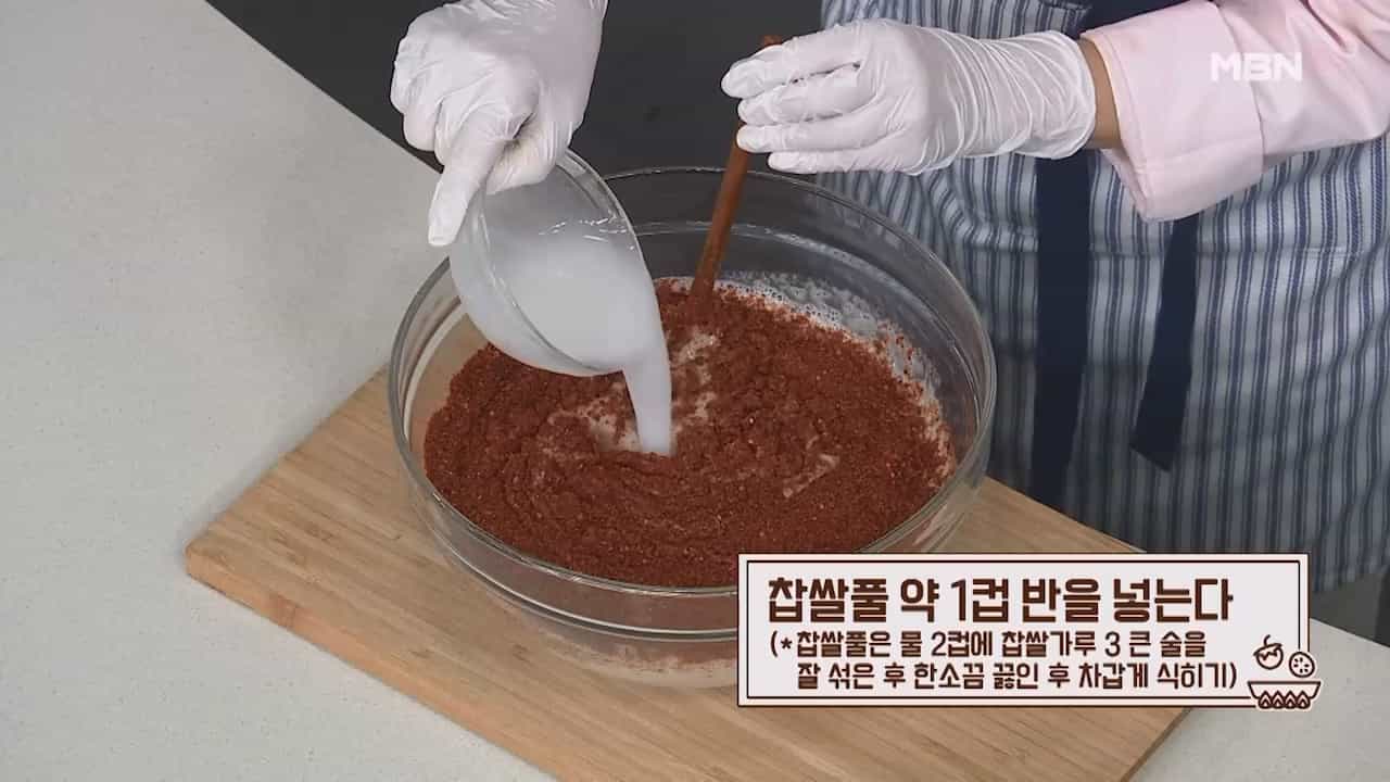 12. 찹쌀풀 약 1컵 반을 넣습니다. (찹쌀풀은 물 2컵에 찹쌀가루 3큰술을 잘 섞은 후 한소끔 끓인 후 차갑게 식혀서 만듭니다.)